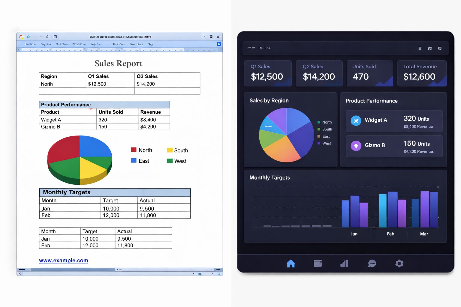 Or skip the suggestions and tell it exactly what you want. "Make the header blue and add a summary section." "Turn this Word doc into a clean HTML dashboard." A dated document from 2015 can become a sleek modern report with one sentence.